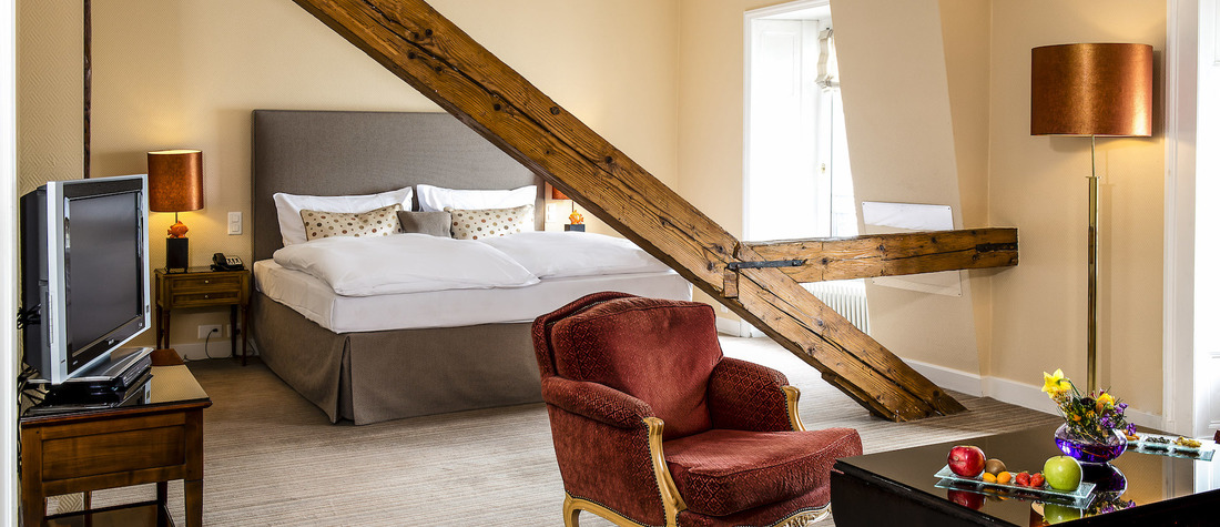 La chambre Supérieure Lac offre une vue imprenable sur le lac Léman et les Alpes, située au dernier étage de notre établissement, elle sont spacieuse et atypique.